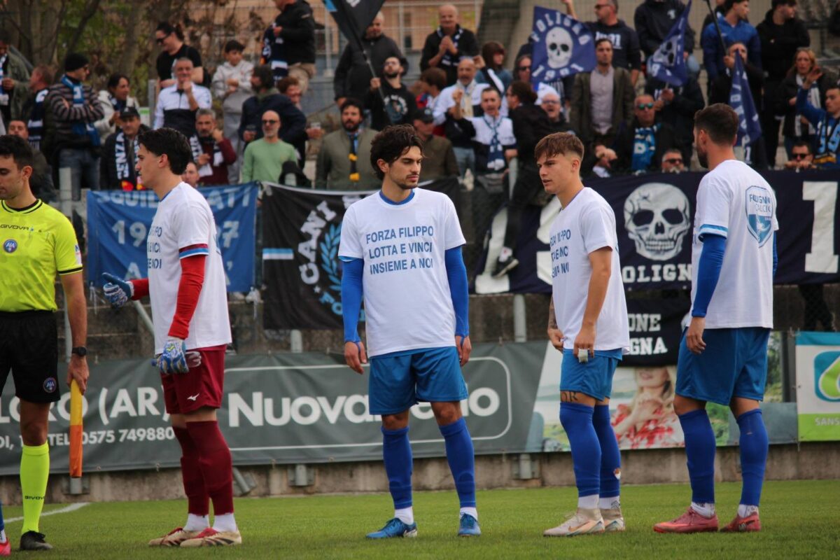 FOLIGNO – “Forza Filippo lotta e vinci insieme a noi”. È il messaggio scritto sulle maglia, indossate dai giocatori del Foligno prima della partita contro il Sansepolcro e rivolto al tifoso Filippo, rimasto coinvolto in un grave incidente stradale.