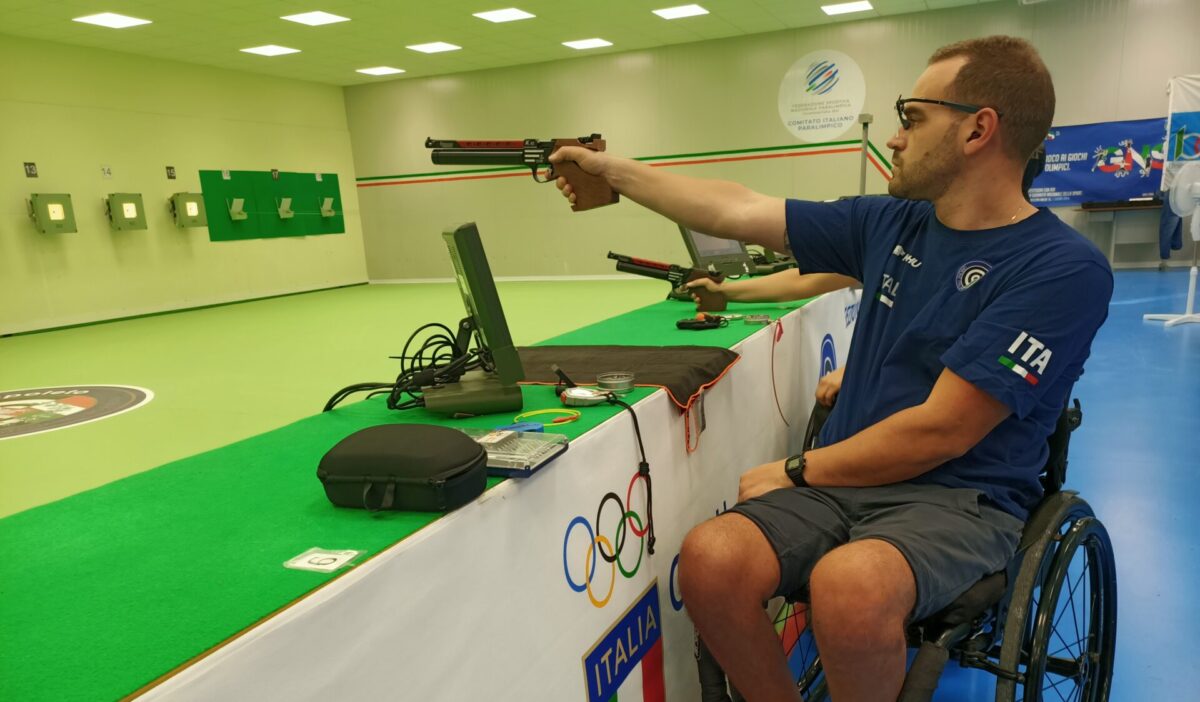 Nell’estate del 2024 subisce un piccolo infortunio alla spalla che lo ferma temporaneamente dall’attività del nuoto, così per rimanere sempre attivo, viene a conoscenza che a Spoleto da qualche anno esiste un Centro di Tiro a Segno Paralimpico di rilevanza Federale.