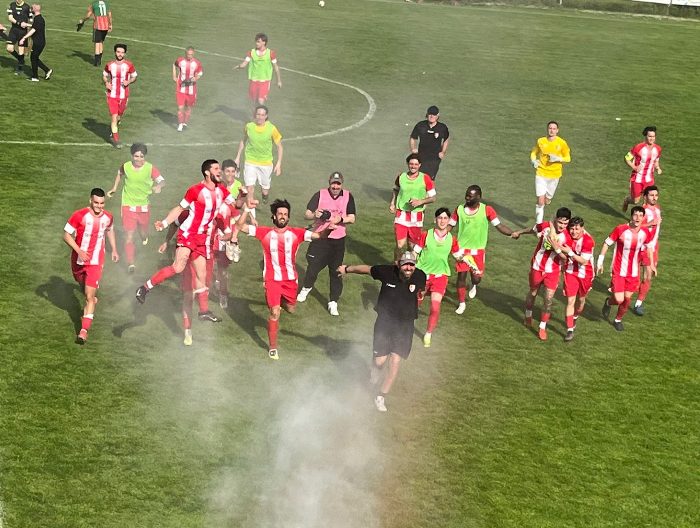 Sul punto di battuta ci sono Colarieti e Kola, ma é il capocannoniere del campionato d’Eccellenza (celebrato a inizio gara per i 250 goal in carriera) a prendere la mira col mancino e a trasformare il piazzato mettendo la palla appena sotto la traversa ospite. Esplodono così di gioia i tamburi dei tanti tifosi biancorossi al campo.