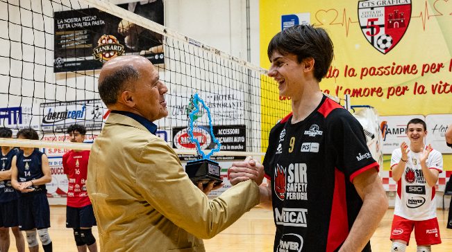 Il classe 2009 che vanta già più di una convocazione nella Nazionale U18 è stato premiato come MVP della finale. A consegnarli il trofeo è stato il Presidente della FIPAV Umbria Agostino Benedetti (foto).
