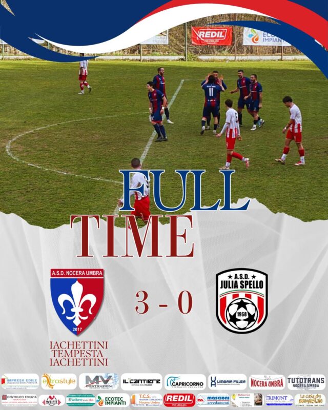 Spello che prova a reagire, ma il Nocera gioca con intensità ed aggressività: al 28’ palla rubata sulla trequarti, cross di Cacciamani verso il secondo palo dove di testa Tempesta riesce a insaccare. Al 38’ il tris, con traversone ancora di Cacciamani e Iachettini, con un tiro al volo un po’ sporco, supera ancora il portiere spellano. Nella ripresa gestione dei locali e nulla cambia.