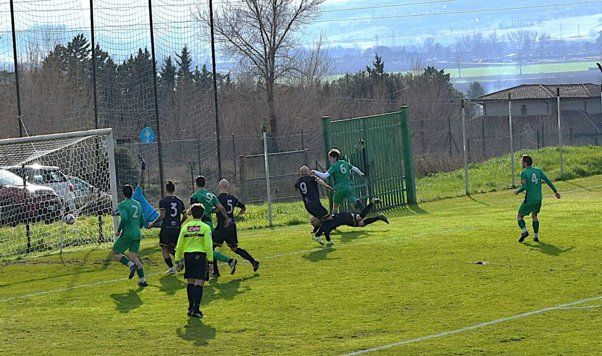Poco prima dell’intervallo, al terzo minuto di recupero, la Vis Foligno pareggia: Miceli svirgola un pallone vagante nell’area degli ospiti, il pallone carico d’effetto inganna Palanca che con un balzo all’indietro prova a deviare la palla in angolo ma ottiene il solo effetto di accompagnarla nella propria rete.