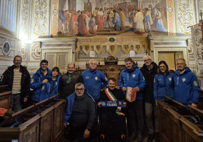 FOLIGNO – “Ho voluto ricevere nella sala consiliare i rappresentanti del Vespa Club Foligno, che quest’anno, per la prima volta nella loro storia, come ha spiegato il presidente Marco Tomassini, hanno vinto il campionato rievocazioni storiche a squadre”.