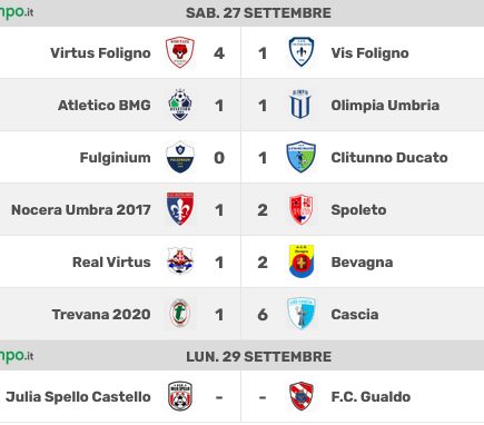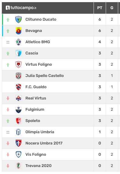 SPOLETO (S. G.) – Seconda giornata In attesa del recupero di lunedì 29 settembre tra Julia Spello Castello e F.C. Gualdo (entrambe hanno la possibilità, vincendo, di arrivare a 6 punti), sono due le squadre a punteggio pieno al termine del secondo turno di andata: il Bevagna e la Clitunno Ducato.