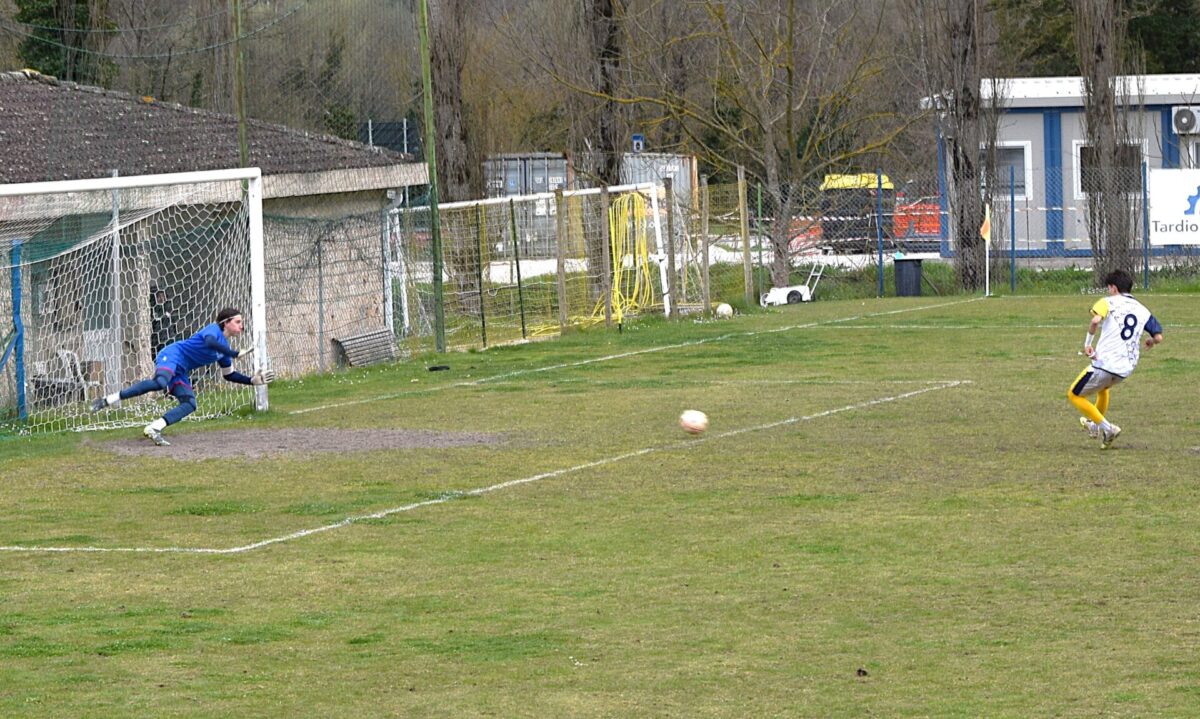La partita clou si gioca al ‘Santi’ di Castel San Felice protagoniste lo Spoleto (potenziale primo in classifica) e il Bevagna (terzo della classe). Le due squadre provano a battagliare fin dal primo minuto ma non fanno i conti con la pessima giornata dell’ex CAN D Andrea Reali di Foligno chiamato a dirigere la contesa. Il fischietto della sezione di Foligno inventa di sana pianta il rigore che dopo quindici minuti Giglioni si fa parare (o sbaglia?) da Meriggioli (vedi foto).