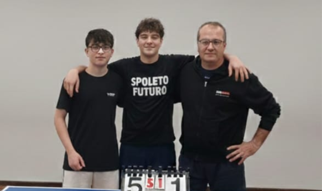 A fare la voce grossa tra gli spoletini è senza dubbio la formazione del “T.T. Spoleto Futuro” che, dopo il sonoro 5-0 rifilato alla seconda della classe San Giustino, ha conquistato il vertice della classifica del girone B di serie D1. Non contenta, la squadra trainata dal talento del classe 2011 Pietro Paloni e dal carisma del rientrante classe 2010 Christian Tetti ha concesso il bis nell’ultima giornata a Perugia con un secco 5-1 ai danni della terza forza del campionato. I risultati centrati nelle ultime gare avvicinano i giovani spoletini al sogno della promozione in C2, ma tutto può ancora accadere nei quattro incontri da disputare da qui a fine campionato.