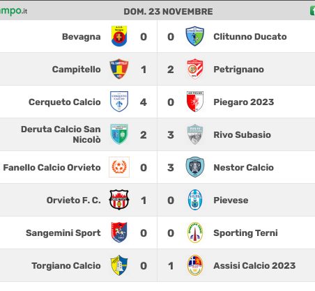 Sicuramente non una buona prova quella disputata da due team in lotta per posizioni importanti, i quali hanno dimostrato una discreta solidità nelle retrovie ma anche carenza di idee e mancanza di lucidità sotto porta. Lucidità che sarà assolutamente necessaria nelle sfide che attendono nella tredicesima giornata Bevagna e Clitunno Ducato, chiamate alla vittoria contro squadre sulla carta inferiori: i primi sul campo del Rivo Subasio, i secondi fra le mura amiche contro il fanalino di coda Fanello Orvieto.