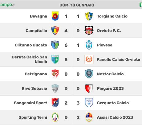 CLITUNNO DUCATO: Roani, Cuna N. (39’st Ivani Al.), Cuna A., Ciuffetti (26’st Gramaccioni), Bucciarelli, Rosi, Gjinaj, Biocco, Stella (26’st Crispini), Ammenti (40’st Ricci), Sabatini (42’st Padovini). A disp: Ivani An., Pacifici, Fedeli, Rapposelli. All: Ricci.