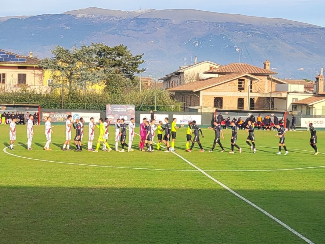 Toscani che fin dai primi giri di orologio si dimostrano aggressivi e ingabbiano con un pressing organizzato i padroni di casa, costruendo la prima occasione al 6’, quando Carli, spesso lasciato solo fra la linea della difesa e quella del centrocampo, tira dalla lunga distanza una bordata respinta da Vassallo. Con lo scorrere dei minuti gli umbri crescono e si rendono pericolosi con un paio di ripartenze, una delle quali, al 20’, libera in area Gnazale, che si gira e cerca lo specchio con una conclusione che si infrange sulle gambe dei difensori di Mister Maraia. La seconda parte del primo tempo è caratterizzata da frequenti ribaltamenti di fronte ma anche dalla totale assenza di chiare occasioni da rete, salvo il tentativo dai 25 metri di Iezzi giunto quasi alla mezz’ora e finito di poco sopra alla traversa della porta cannarese.