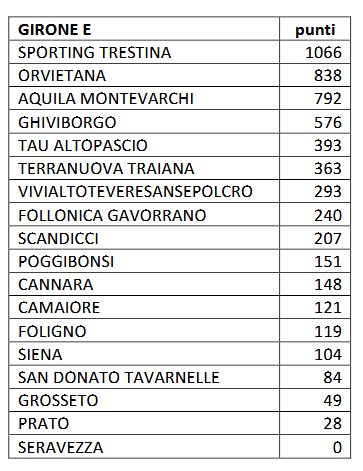 Ebbene al giro di boa le squadre umbre hanno fatto la voce grossa. Si ma non si tratta di Foligno e Cannara bensì di Trestina ed orvietana rispettivamente prima e seconda. Il Trestina totalizza 1066 punti ed incassa 25mila euro, mentre l’Orvietana accumula 838 e vice 15mila euro. per la cronaca al terzo posto si pazza l’Aquila Montevarchi (792), quarta è il Ghiviborgo (576) e quinta il Tau Altopascio (393).